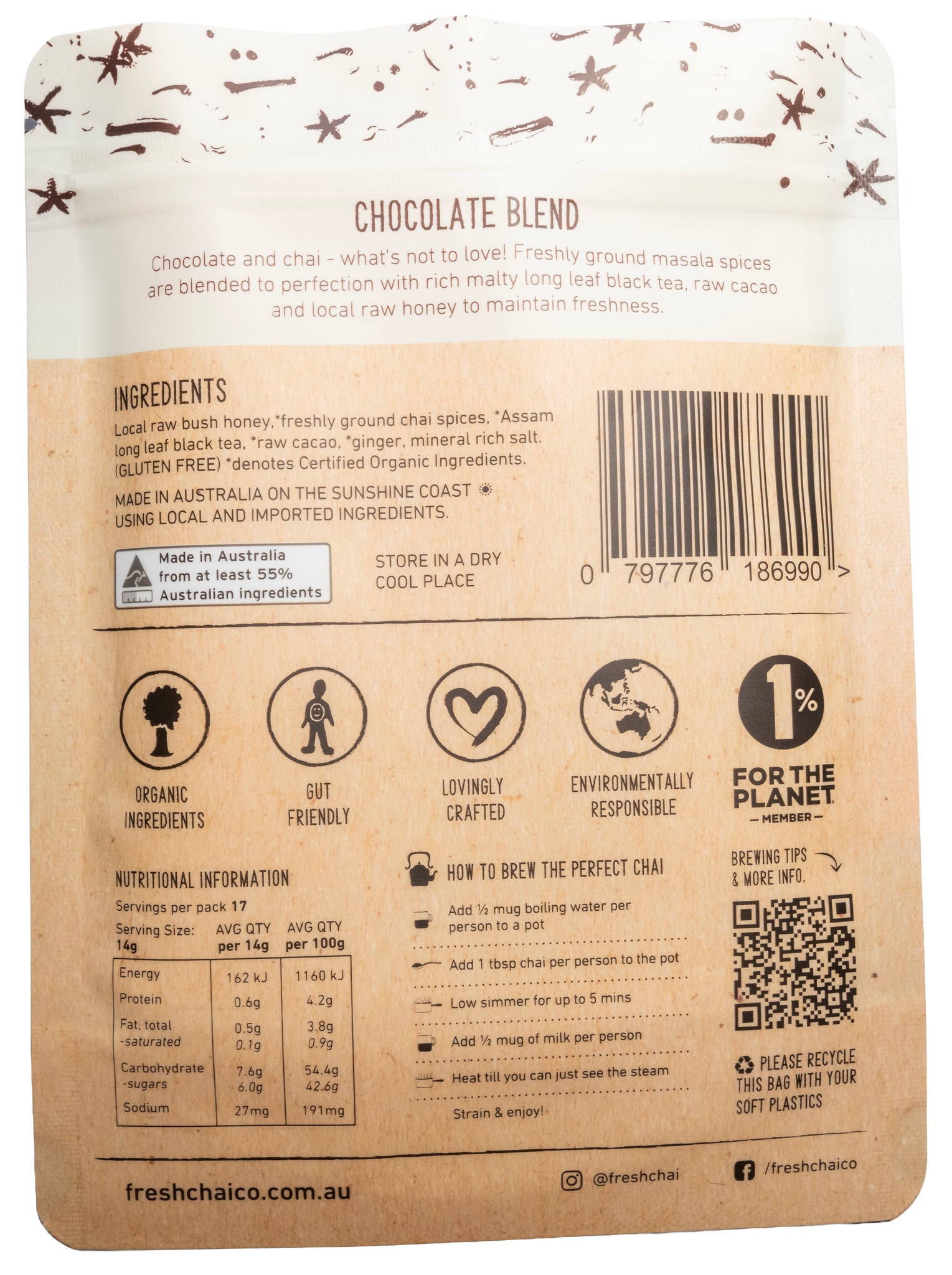 It's a classic seven spiced chai with deep chocolate flavours behind it. Precision freshly ground whole spices are blended to perfection with rich, malty Assam long leaf black tea, and raw cacao. The chai is then soaked in local raw honey to preserve the spices and make the most delicious chai imaginable…